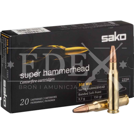 Amunicja myśliwska SAKO w kalibrze 308 Win 9,7 g Super Hammerhead to pocisk o grubym płaszczu, silnym i nieodpryskowym, zapewniający kontrolowaną ekspansję. Spójna konstrukcja rdzenia umożliwia duże zatrzymanie ciężaru, powoduje dobrą penetrację. Stożkowy rdzeń daje wysoką wydajność balistyczną, powoduje spłaszczenie trajektorii. Wynalezione i testowane w laboratoriach SAKO, objęte obszernymi testami myśliwskimi.