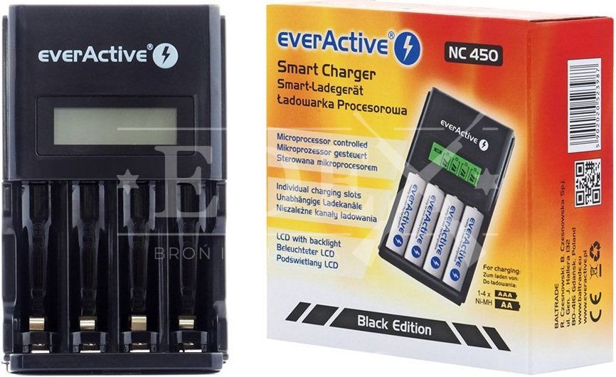 NC450 Black Edition to szybka i wydajna ładowarka mikroprocesorowa marki everActive z wyświetlaczem LCD, która umożliwia jednoczesne ładowanie akumulatorów AA i AAA. Jest to udoskonalona kontynuacja znakomitej ładowarki NC-450. Produkt przeznaczony jest do współpracy wyłącznie z akumulatorami typu NiMh. Ładowarka posiada specjalne zabezpieczenia, które chronią urządzenie przed przegrzaniem, przeładowaniem baterii i zwarciem w trakcie ładowania. Dodatkowo wyposażona została w duży czytelny wyświetlacz LCD z zielonym podświetleniem, na którym możesz sprawdzić poziom naładowania baterii. Ładowarka zaprogramowano by automatycznie zamykała proces ładowania. Ładowarka posiada również funkcję regeneracji skrajnie rozładowanych akumulatorów. Aukcja dotyczy ładowarki + kabel zasilający 230V (w zestawie nie ma akumulatorków).