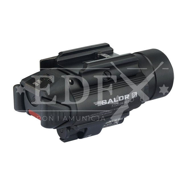 Latarka z celownikiem laserowym na broń. Całość zasilana jest dwoma bateriami CR123A, co dzięki wydajnej diodzie o barwie Neutral White i optyce PMMA TIR (soczewka/kolimator), zapewnia strumień światła na poziomie 1120 lumenów i zasięg do 240 m. Czerwony laser o mocy <5mW ułatwia szybkie namierzenie celu bez konieczności zgrywania muszki ze szczerbinką. Model BALDR RL wyposażono w szynę montażową kompatybilną ze standardem 22 mm (weaver/ picatinny/ MIL-STD-1913). System stalowych zacisków pozwala na szybkie zamocowanie latarki na broni.