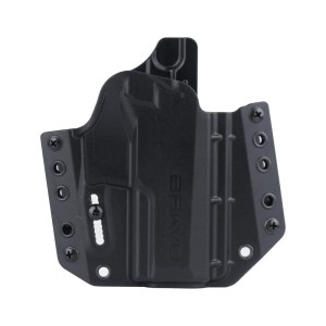 Kabura posiada przedłużoną ścianę tylną, która chroni broń przed potem i bezpośrednim kontaktem ze skórą i ubraniami. Regulowany opór chwytu pozwala dostosować siłę retencji. Model wyposażono w sztywne klipsy montażowe, przystosowane do pasów o szerokości 38 mm.