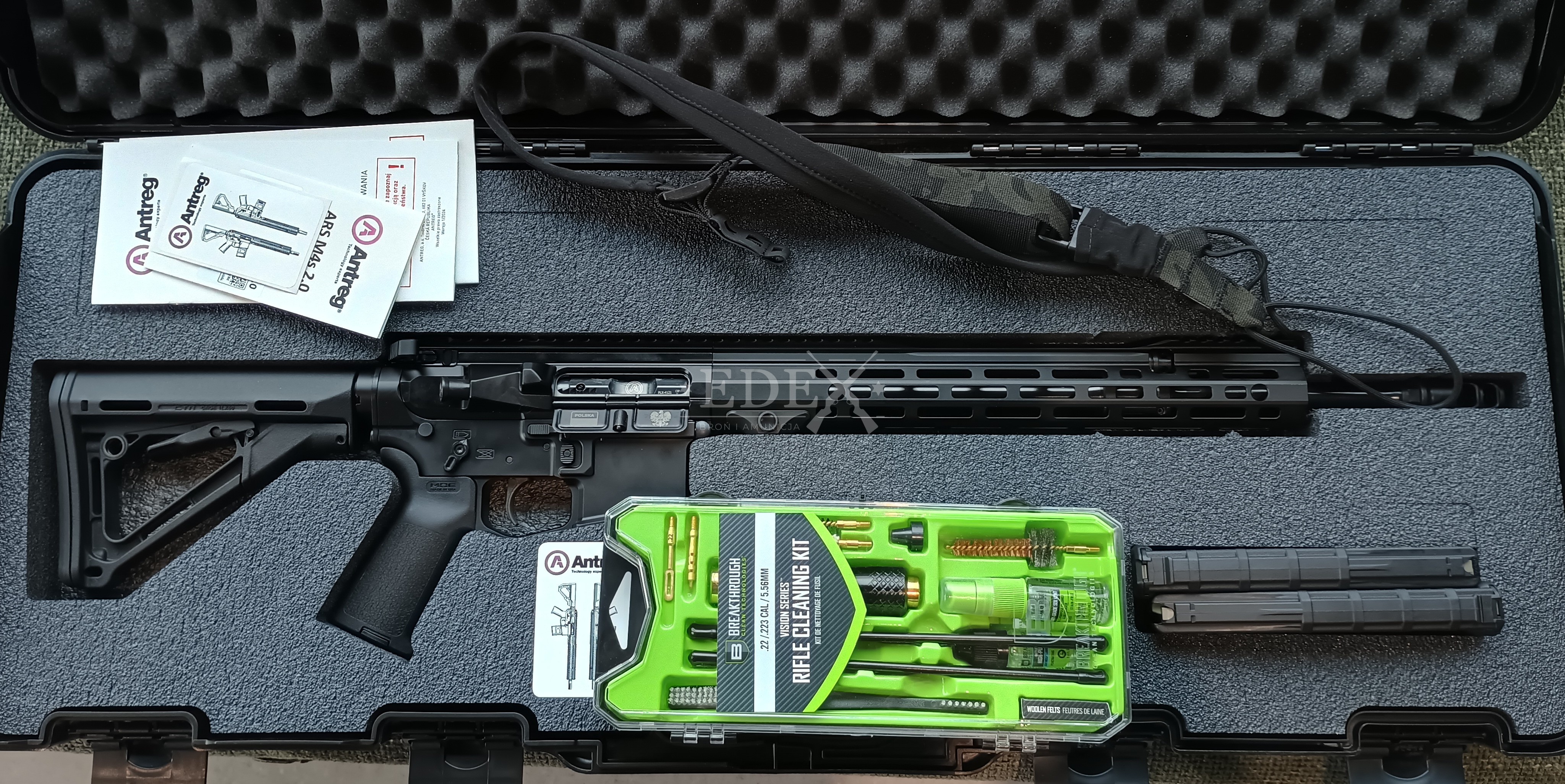 W zestawie: walizka, zestaw do czyszczenia i konserwacji, pas nośny, 2 magazynki.
