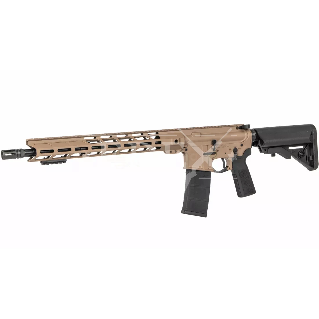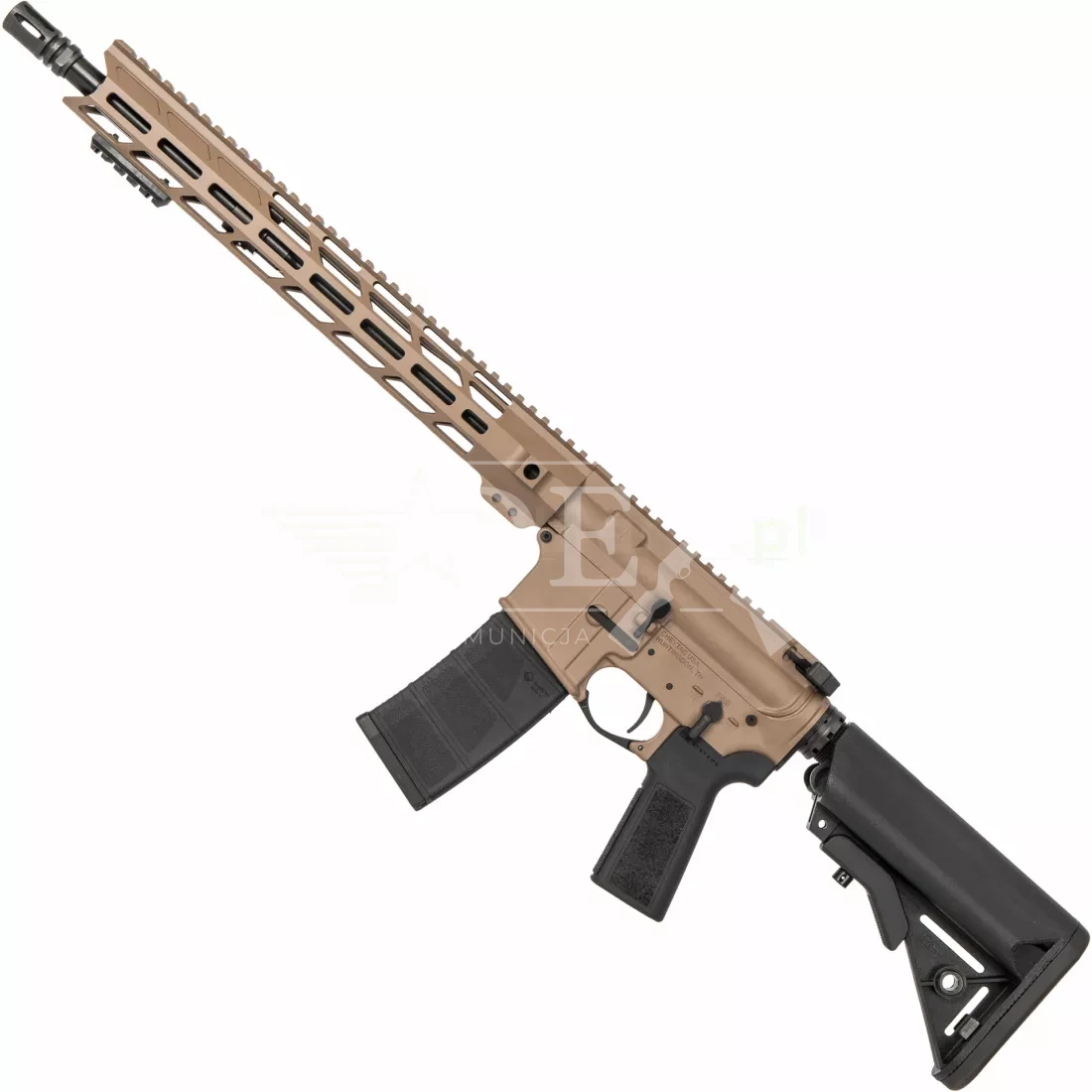 W karabinie zastosowano pełnowymiarowy zespół Bolt Carrier Group (Full Auto Cut & Rated BCG), wyposażony w prawidłowo zakuty klucz gazowy (properly staked). Takie rozwiązanie zwiększa trwałość całego układu, zapewniając długą i bezawaryjną eksploatację nawet w najbardziej wymagających warunkach. Z przodu karabinu znajduje się 14,75-calowy handguard w systemie M-LOK, wykonany metodą precyzyjnego frezowania CNC z aluminium klasy 6061-T6. Posiada on zintegrowane gniazda QD do montażu zawieszenia, co zwiększa funkcjonalność i pozwala na szybkie i łatwe dostosowanie broni do indywidualnych preferencji strzelca.