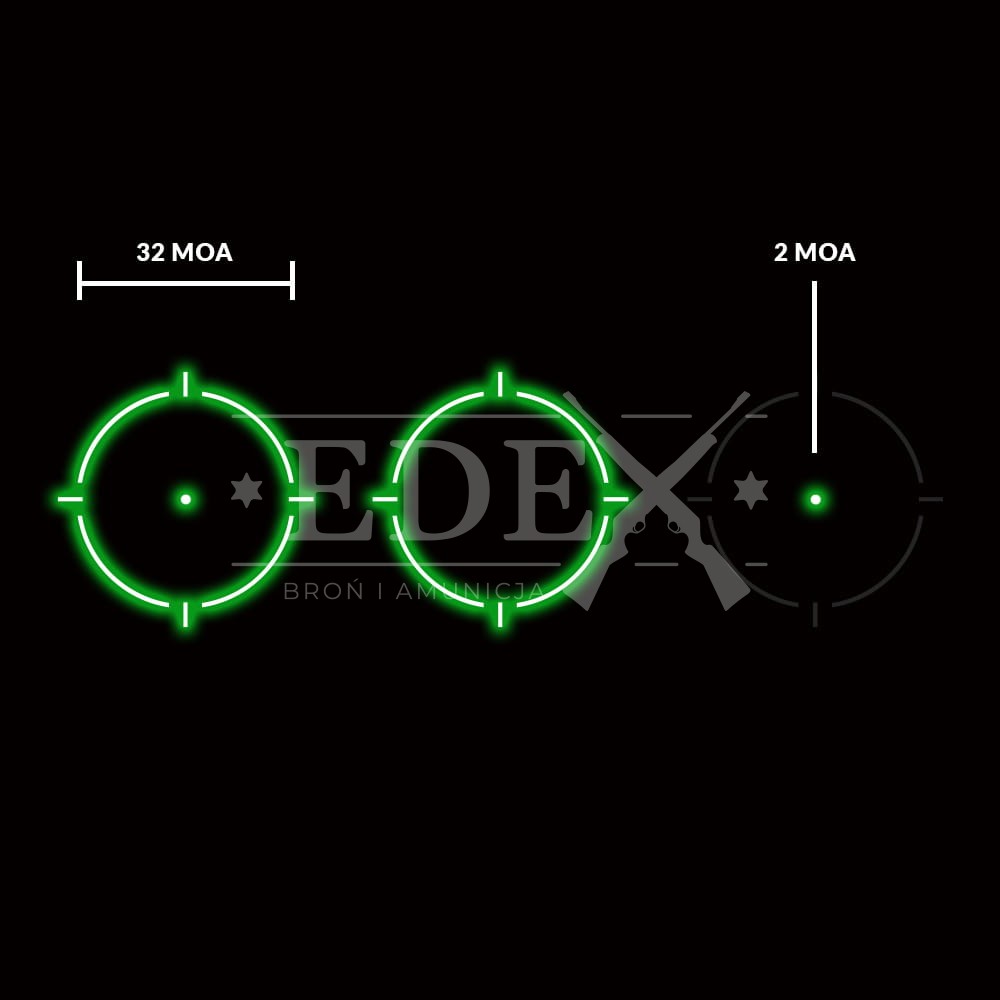 | Rozmiar punktu celowniczego | Kropka 2 MOA Okrąg 32 MOA |