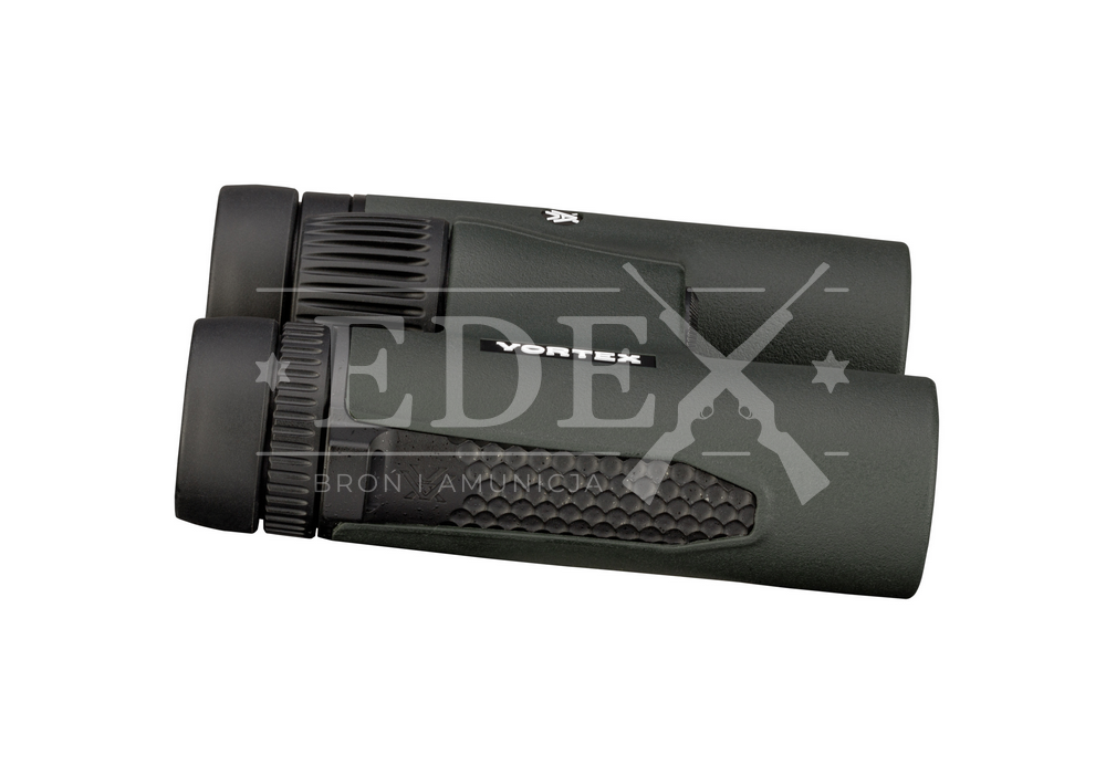 Konstrukcja jest uszczelniona, co gwarantuje jej wodoodporność oraz ochronę przed zapyleniem wnętrza. Wypełnienie azotem chroni optykę przed parowaniem w niskich temperaturach. Powierzchnia lornetki została pokryta gumowym tworzywem antypoślizgowym, który zapewnia dodatkową ochronę oraz pewny chwyt, nawet w wilgotnych warunkach. Vortex Triumph HD 10×28 ma również regulowaną długość muszli ocznych, co umożliwia jej dostosowanie do użytku z okularami, zapewniając komfort podczas obserwacji.