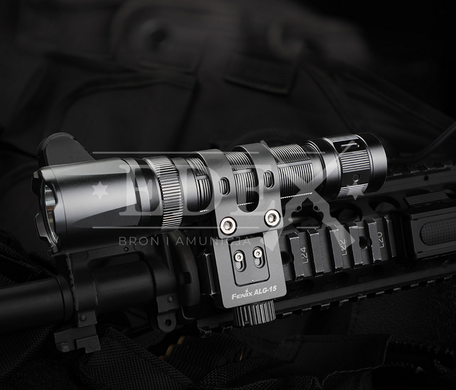 Nowoczesny, niskoprofilowy montaż latarki na broń Fenix ALG-15 charakteryzujący się trwałą aluminiową konstrukcją oraz możliwością zgrabnego wpasowania źródła światła w sylwetkę broni. Sposób umieszczenia pierścieni montażowych sprawia, że latarka znajduje się możliwie blisko osi lufy broni, ograniczając ryzyko zahaczenia o elementy otoczenia. Spójność z systemem Picatinny sprawia, że montaż sprawdzi się na szerokim przeglądzie modeli broni długiej. Możemy zainstalować go zarówno na oszynowanym w omawianym standardzie łożu, jak i za pośrednictwem kupowanych osobno adapterów na systemach M-LOK oraz KeyMod.