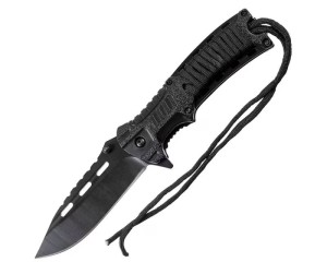 Składany nóż survivalowy wyposażony w krzesiwo, gwizdek alarmowy i odcinek linki Paracord.