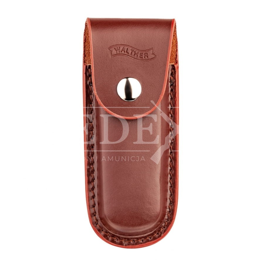 Tradycyjny charakter noża podkreślają eleganckie okładziny z drewna orzecha włoskiego oraz polerowane elementy okucia wykonane ze stali nierdzewnej. Drewniane okładziny z logo Walther zamocowano do szkieletu mosiężnymi pinami. W tylnej części chwytu znajduję się otwór pozwalający na wplatanie rzemienia lub ozdobnego oplotu z paracordu. Skórzane etui zamykane na napę pozwala na wygodne noszenia noża przy pasie.