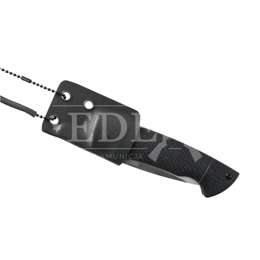 Nóż ma profilowane okładziny wykonane w technologii CNC z laminatu G10. Dzięki drobnej fakturze oraz anatomicznym wycięciom nóż pewnie i wygodnie leży w dłoni. Kydexowa pochewka z linką aumożliwia noszenia noża na szyi lub w kieszeni.