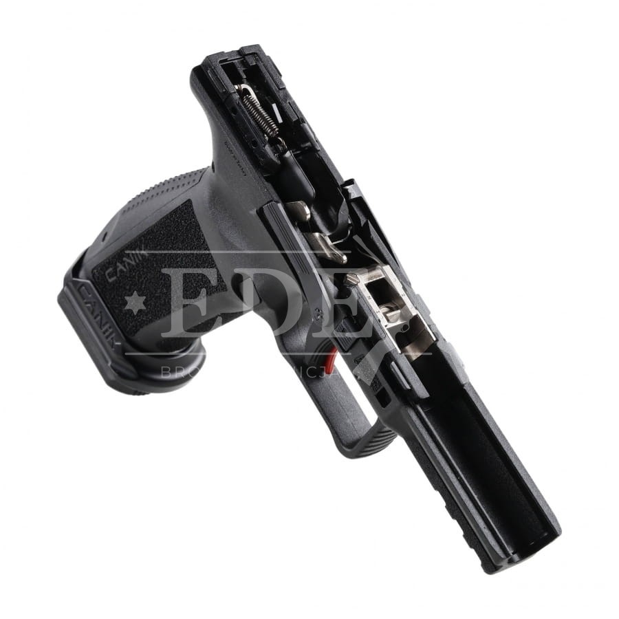 Canik TP9 METE SFx oparto na polimerowym szkielecie o ergonomicznej konstrukcji. Rękojeść ma wymienne tylne panele, dzięki którym każdy strzelec może dopasować wielkość chwytu do rozmiaru Twojej dłoni. W Canik TP9 METE SFx zastosowano szereg drobnych modernizacji wpływających na ergonomię i komfort obsługi broni m.in.: poszerzone gniazdo magazynka, szkieletowy kabłąk podcięty w dwóch miejscach, agresywnie teksturowany chwyt, niskoprofilowy obustronny zrzut zamka, zamek z portingiem oraz szczerbiną z zaczepem ułatwiającym przeładowanie broni jedną ręką. Modyfikacji poddano także sposób częściowego rozkładania broni, który wymaga jedynie użycia wybijaka (w komplecie).