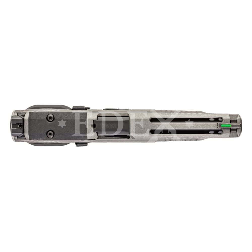 Zamek broni posiada zmodyfikowane względem zwykłej wersji nacięcia w przedniej i tylnej części (są one głębsze i bardziej agresywne oraz w tylnej części posiadają dodatkowy występ) ułatwiające manual na broni, od góry oraz przy wylocie lufy zamek posiada wycięcia zmniejszające masę co w połączeniu z niską osią lufy ogranicza podrzut broni w trakcie strzelania. Lufa o długości 5″ posiada gwint o skoku 1/10″.