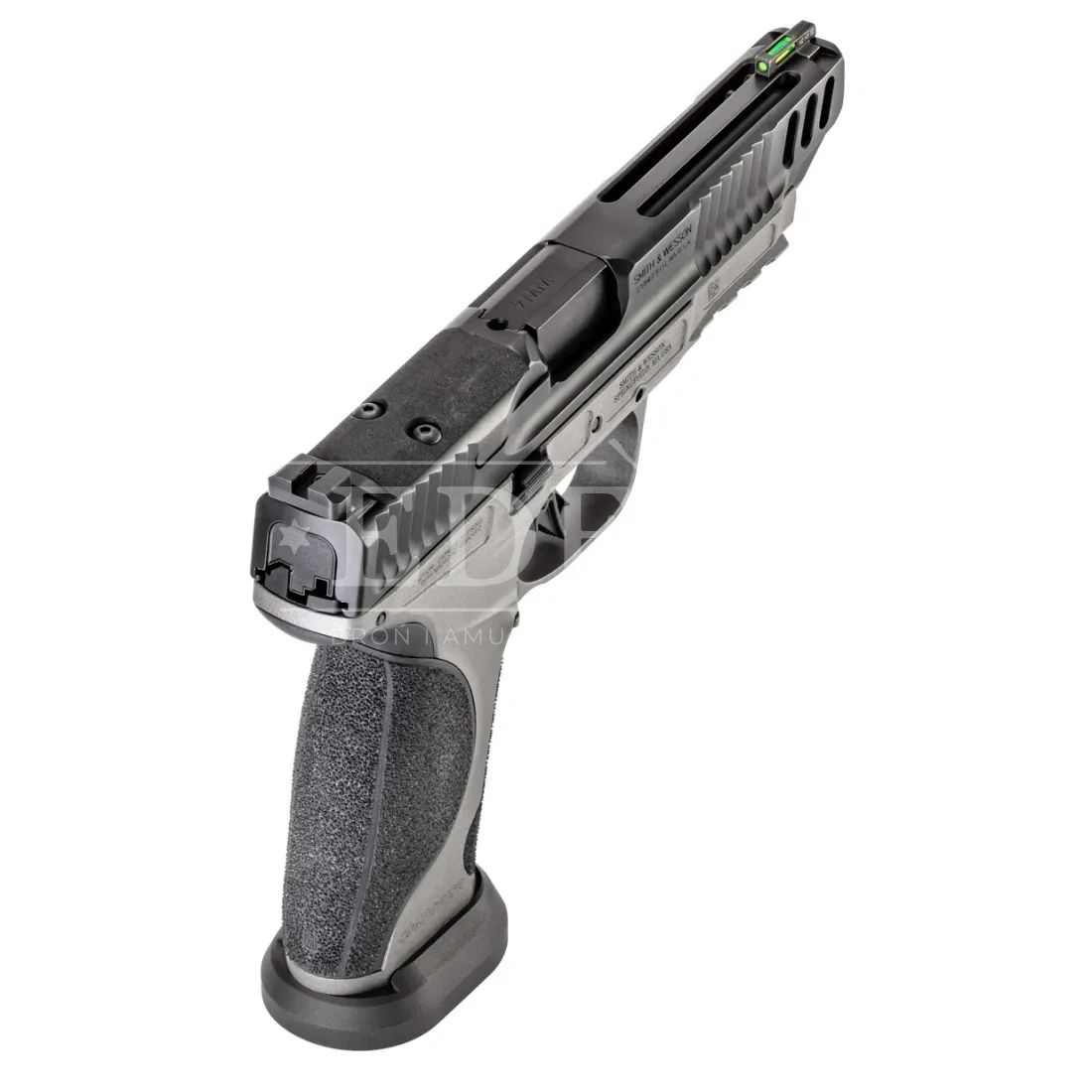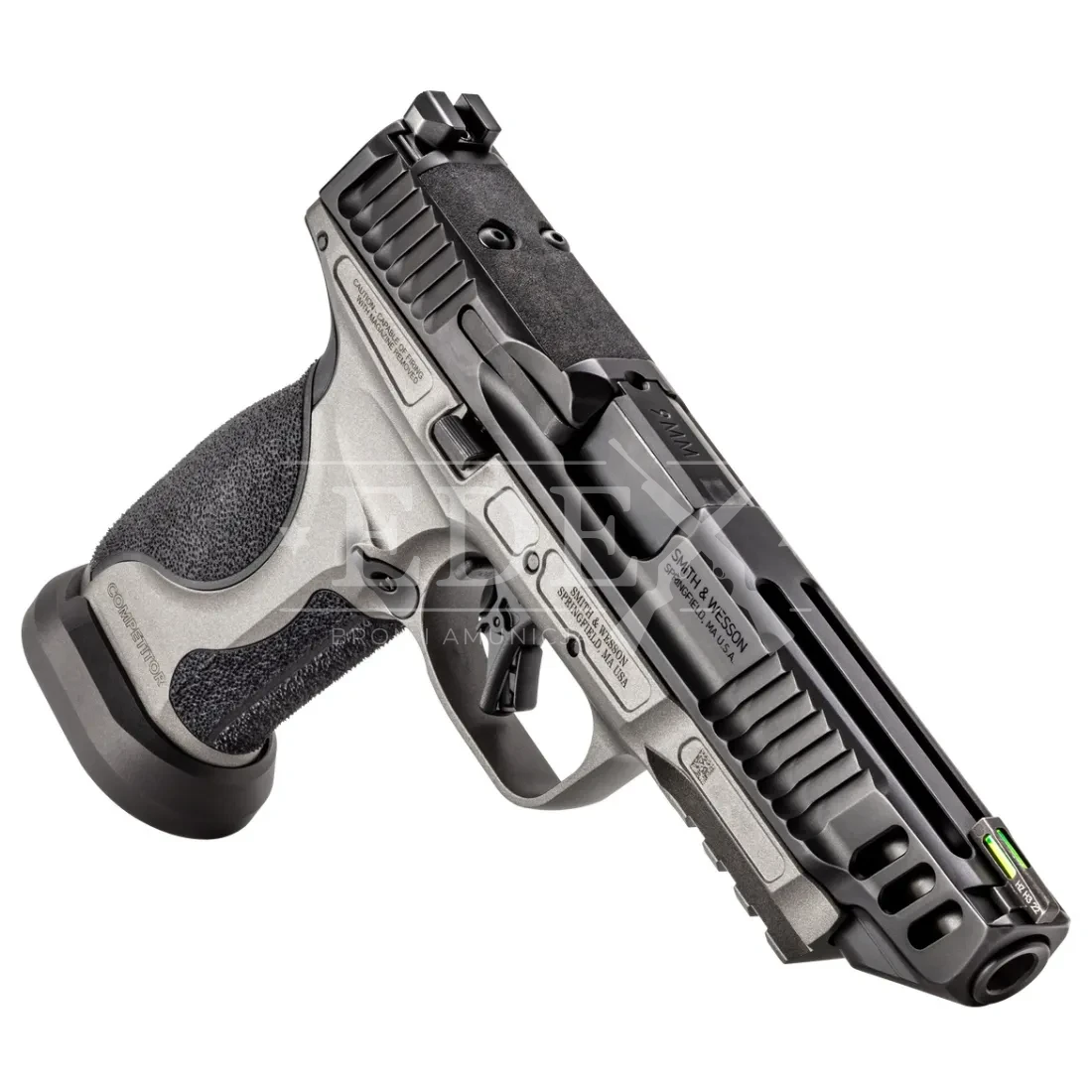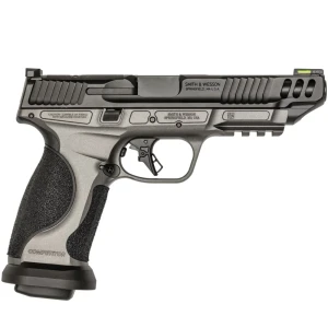 Smith & Wesson M&P9 M2.0 COMPETITOR (Performance Center) to metalowy‑szkieletowy pistolet z 5‑calową lufą, ulepszonym mechanizmem spustowym, optic‑cut na slajdzie, fiber‑optic muszką, powiększonym mag‑wellem, przełożnym zwalnianiem magazynka oraz wykończeniem Tungsten Gray Cerakote®. W komplecie cztery magazynki; pistolet jest dostarczany gotowy do zawodów prosto z pudełka.