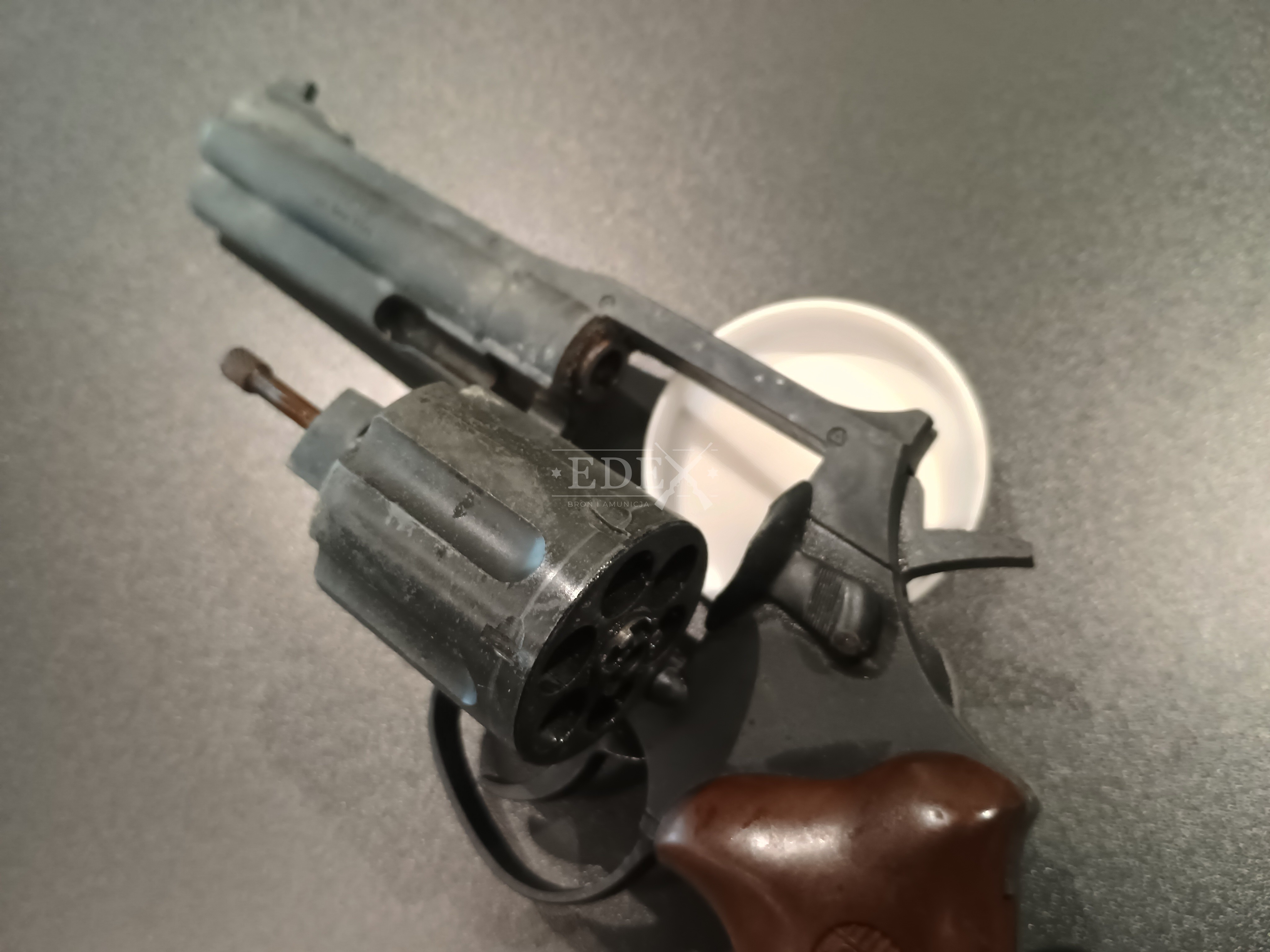 Broń w stanie dostatecznym - zabrudzona, mająca luzy na bębnie, wymaga wyczyszczenia i skasowania luzów na bębnie.