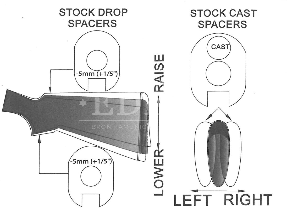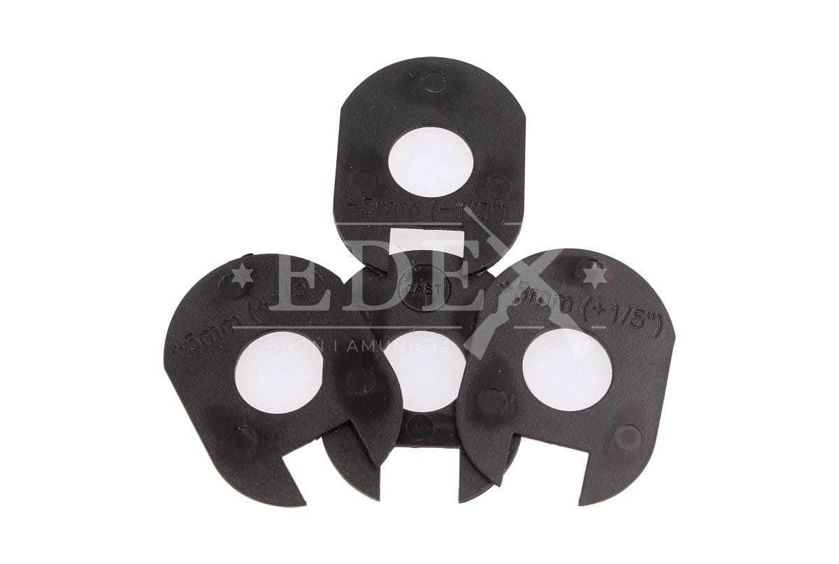 Podkładki dystansowe - umożliwiają regulację kąta nachylenia kolby w dwóch płaszczyznach. Dzięki zawartym w zestawie czterem podkładkom dystansującym proces dostosowania strzelby do własnych potrzeb jest szybki i nieskomplikowany. Wystarczy włożyć odpowiednio wyprofilowane podkładki dystansujące między komorę zamkową a kolbę aby skonfigurować strzelbę zgodnie z własnymi preferencjami jak i stylem strzelania.