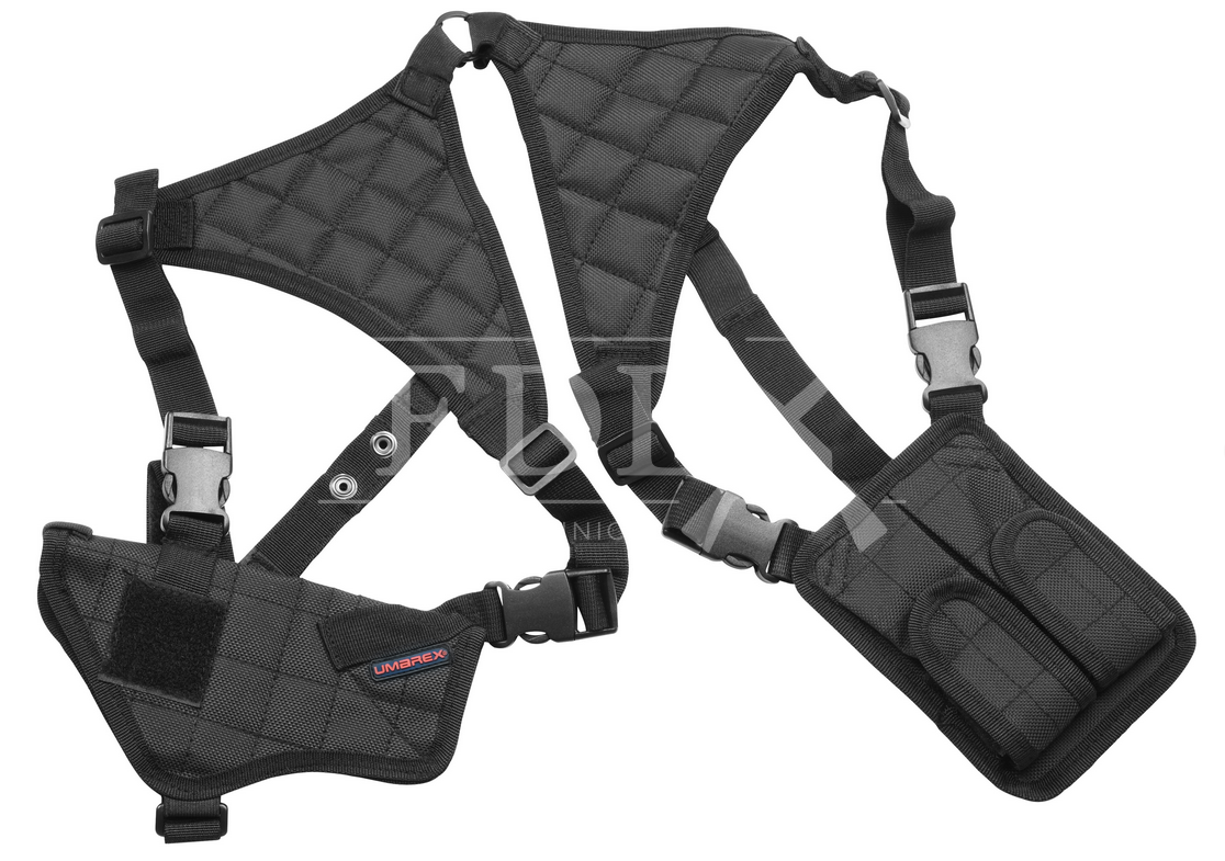 Szelki taktyczne Umarex to umożliwiają dyskretne przenoszenie broni pod ramieniem wraz z zapasowymi magazynkami.