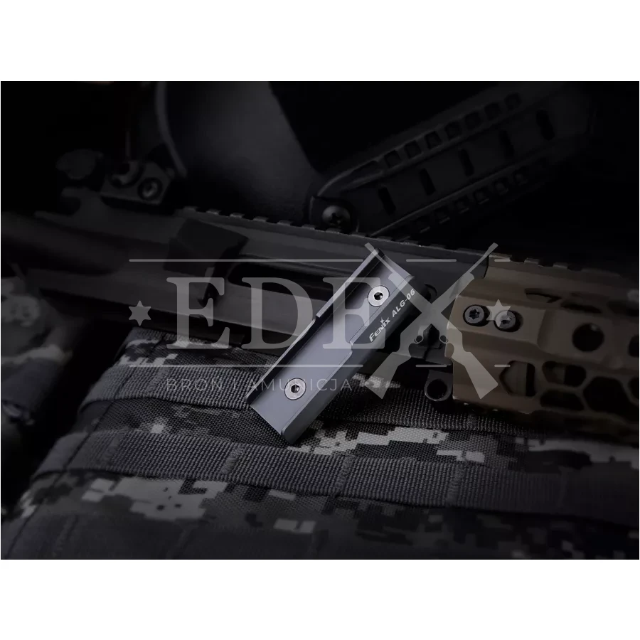 Korpus montażu wykonano ze stopu aluminium A6067-T6, o matowym anodyzowanym wykończeniu typu HA-III. Fenix ALG-05 dedykowany jest do włączników żelowych: AER-02 V2.0, AER-03 V2.0, AER-04 i AER-05 ALG-06 montowany jest na łożu M-LOK za pomocą dwóch śrub oraz samokontrujących nakrętek T-nuts, które zapobiegają przesuwaniu uchwytu pod wpływem odrzutu broni. Przycisk włącznika po wsunięciu do objemy ALG-06 blokują 2 szerokie występy.
