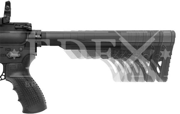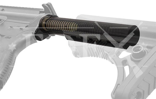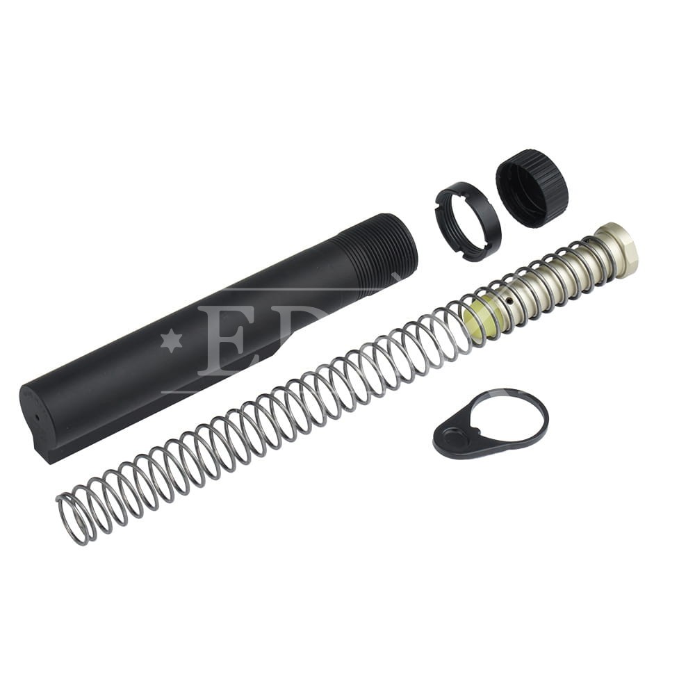 Zestaw 6-pozycyjnej prowadnicy kolby kompatybilnej z karabinkami AR15 w standardzie Mil-Spec. Wykonana z trwałego aluminium 6061-T6. Konstrukcja prowadnicy umożliwia precyzyjną regulację długości. Do zestawu producent dołącza sprężynę, urządzenie powrotne oraz tylną płytkę i nakrętkę prowadnicy kolby.