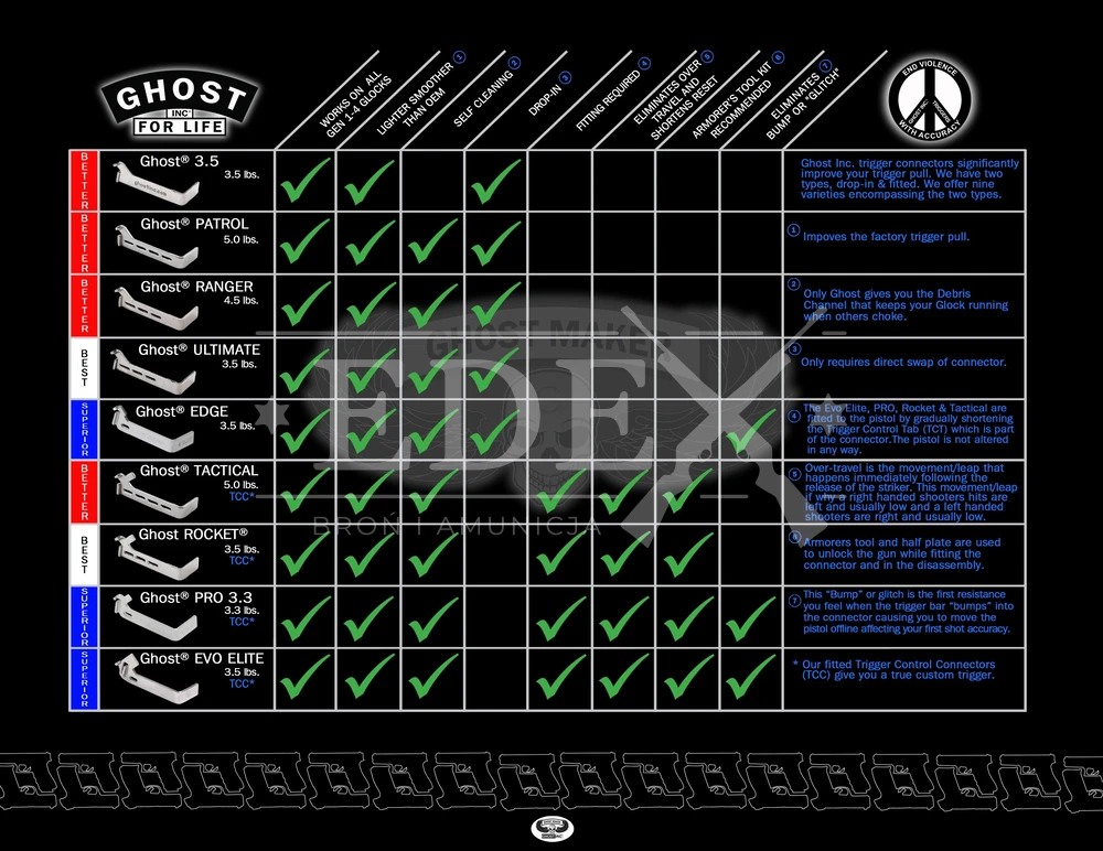 Ghost Edge 3.5 jest przeznaczony przede wszystkim do broni wykorzystywanej jako EDC (do samoobrony), ale stosując dodatkowe z zestawu, można uzyskać niemal sportową charakterystykę pracy spustu.