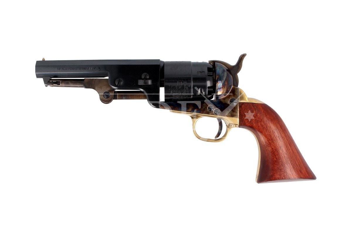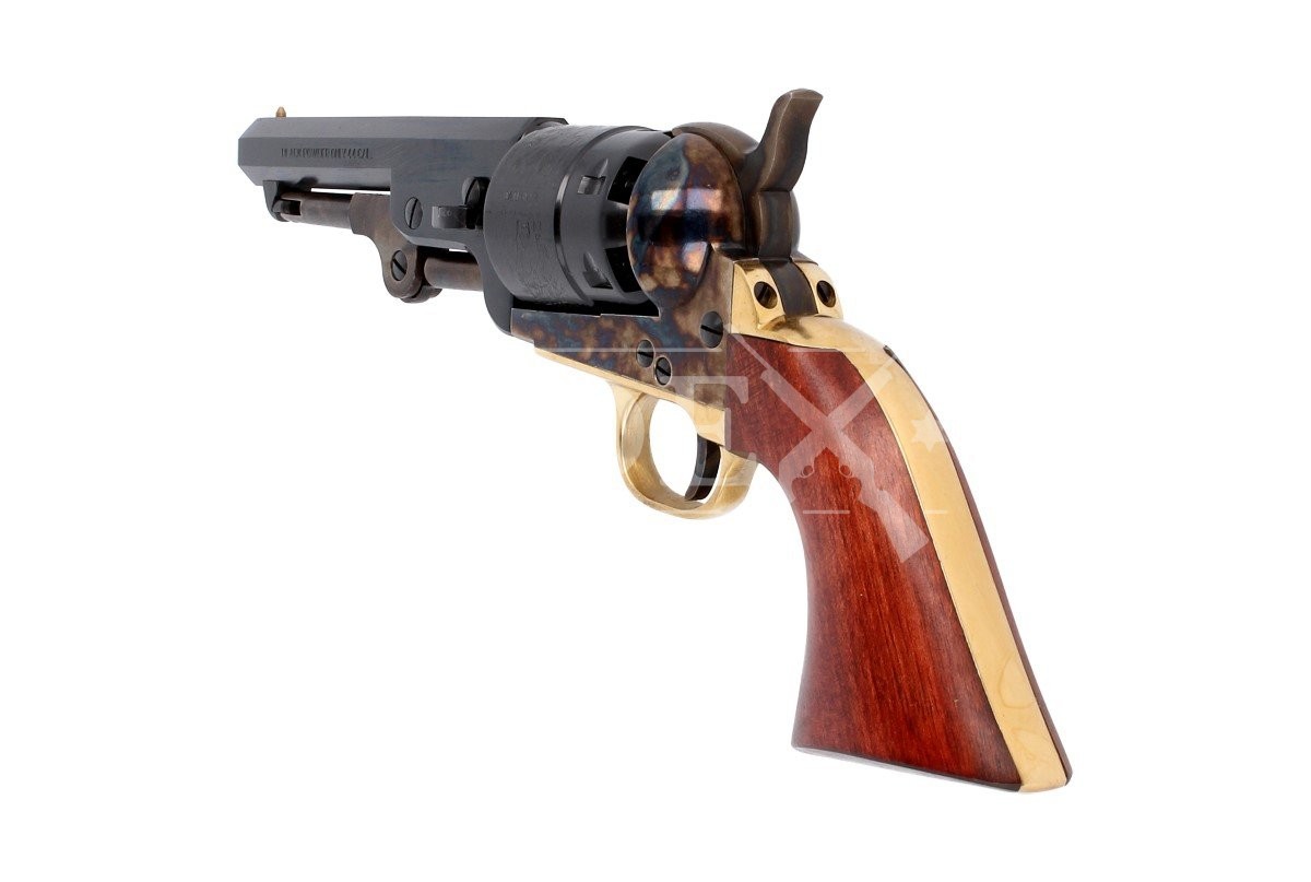 1851 Colt Navy Yank Sheriff .44, zaprojektowany przez Samuela Colta sześciostrzałowy kapiszonowy rewolwer czarnoprochowy w kalibrze .44. Ładowany odprzodowo z ramą stalową otwartą oraz grawerowanym bębnem, sceną zwycięstwa II Texas Navy w bitwie morskiej pod Campeche w roku 1843. Wersja Sheriff z krótką lufą, doskonała do szybkiego dobycia oraz szybkiego strzelania podczas zawodów dynamicznych.