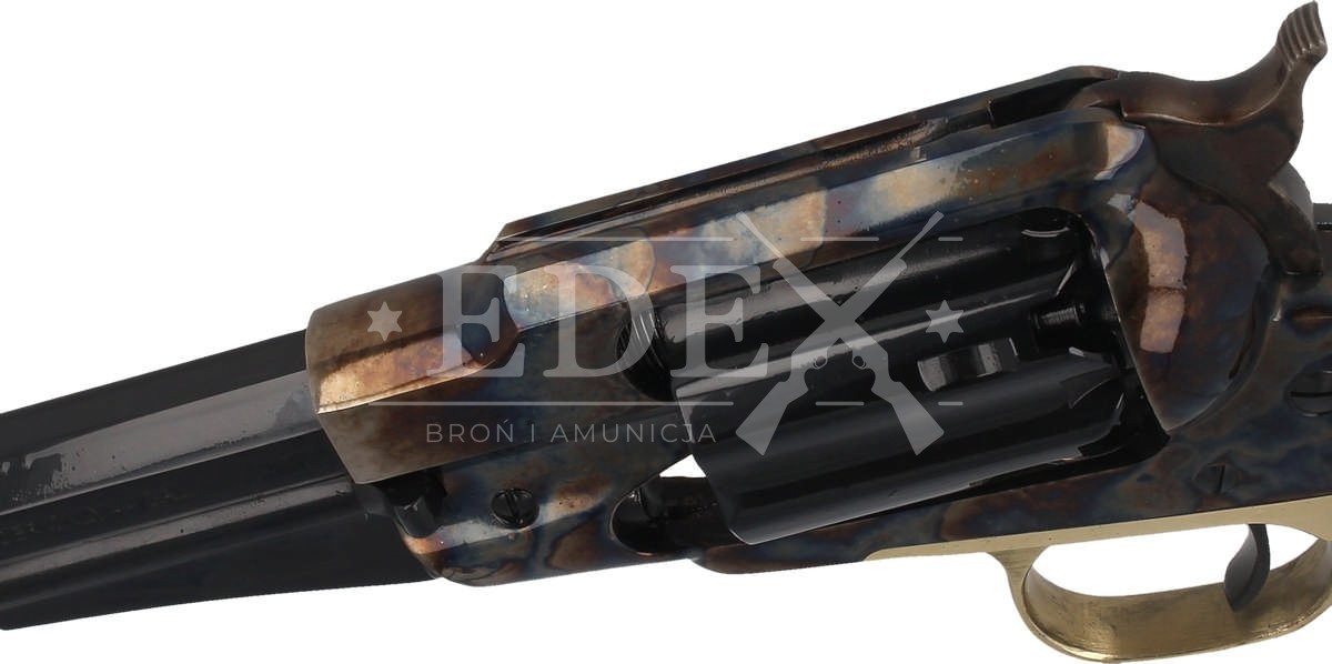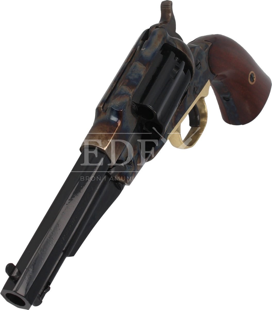 Remington 1858 New Model Army Sheriff .44, sześciostrzałowy kapiszonowy rewolwer czarnoprochowy firmy Pietta w kalibrze .44, ładowany odprzodowo ze stalową ramą hartowaną ogniowo i wklęsłym bębnem.