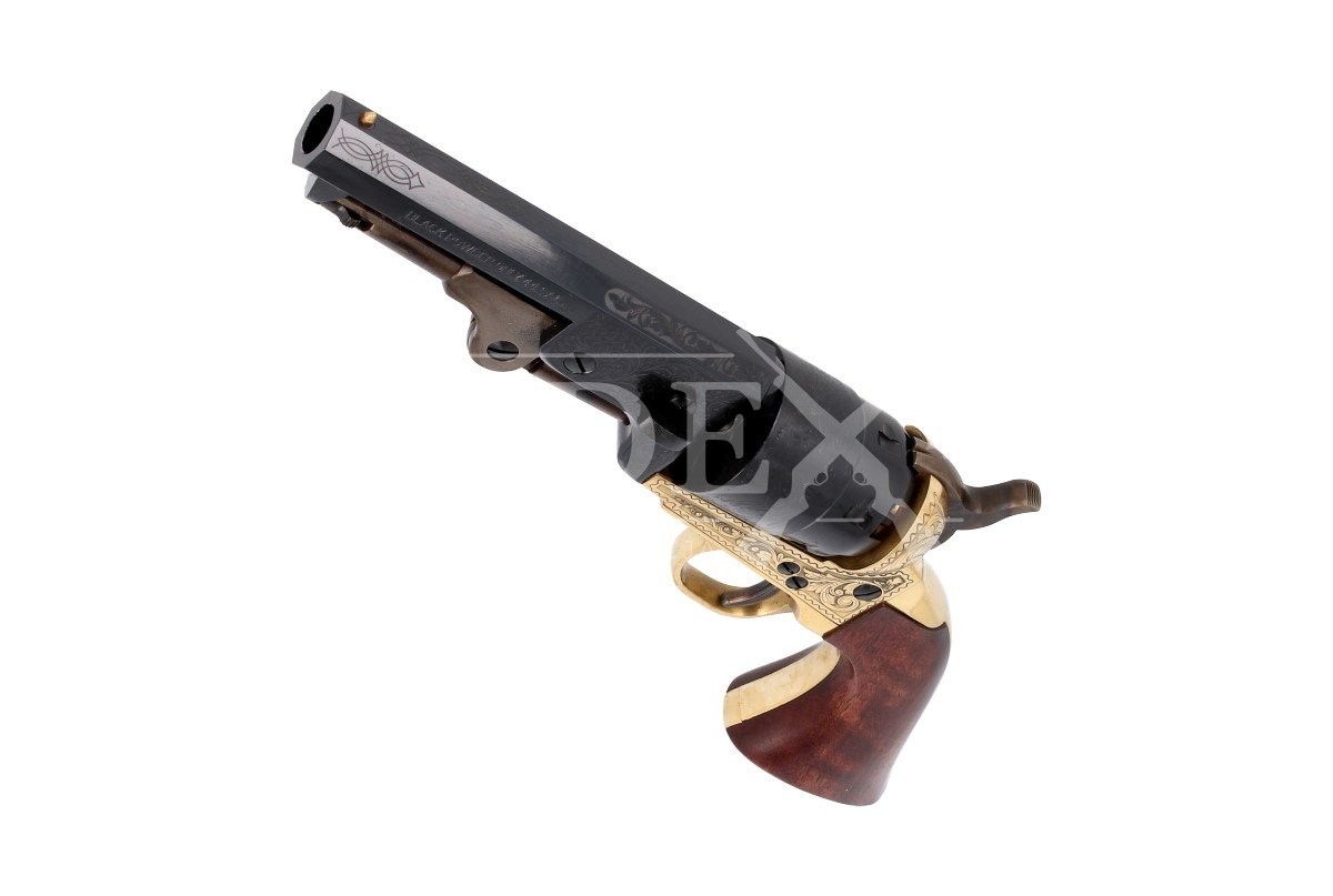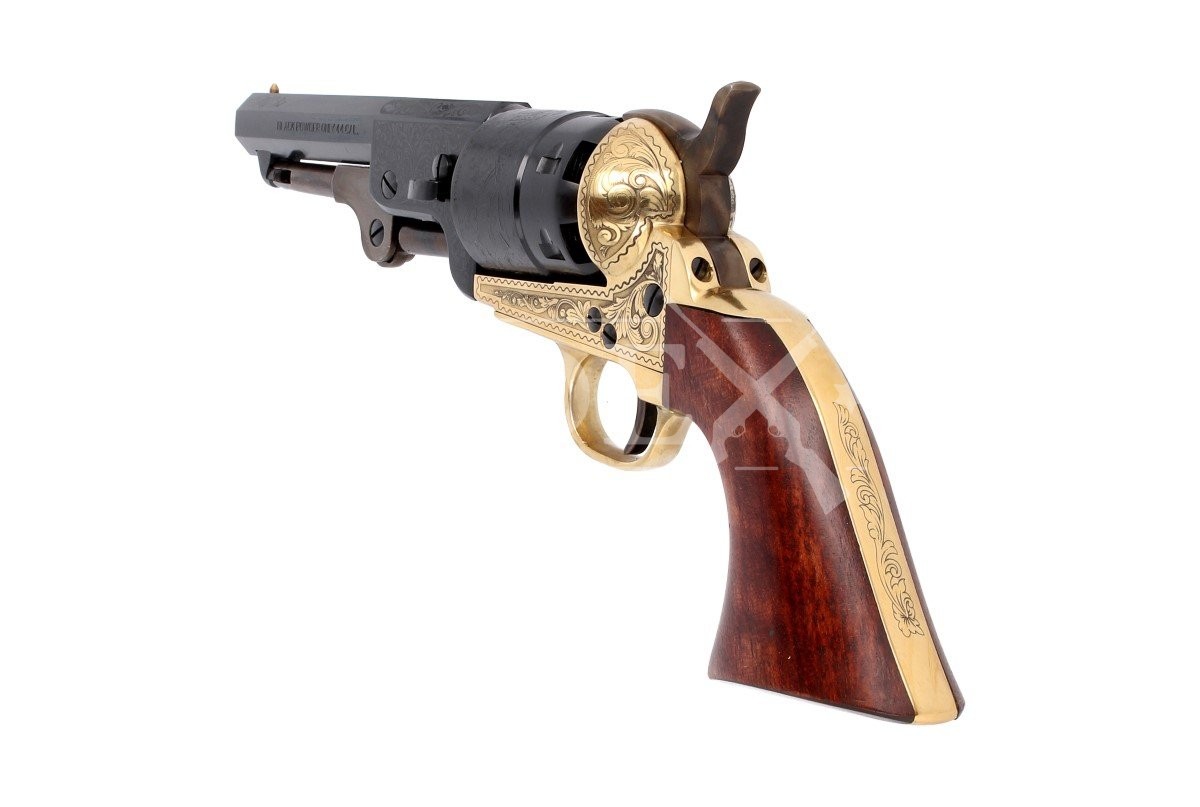 1851 Colt REB Nord Navy De Luxe Sheriff .44, zaprojektowany przez Samuela Colta sześciostrzałowy kapiszonowy rewolwer czarnoprochowy w kalibrze .44. Ładowany odprzodowo z mosiężną ramą otwartą. Zdobiony grawerowanymi mechanicznie motywami roślinnymi: okucia chwytu, lufa oraz rama. Cylinder bębna z wygrawerowaną scena zwycięstwa II Texas Navy w bitwie morskiej pod Campeche w roku 1843. Wersja Sheriff z krótką 4.875" lufą, idealną do szybkiego strzelania na krótkich dystansach.