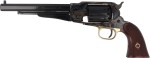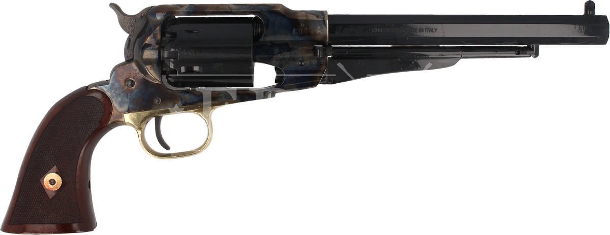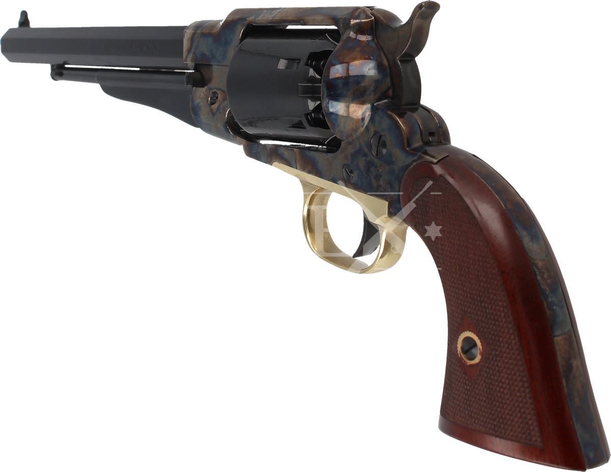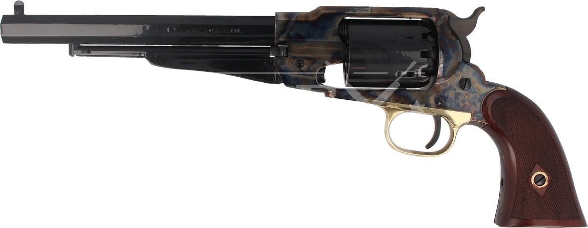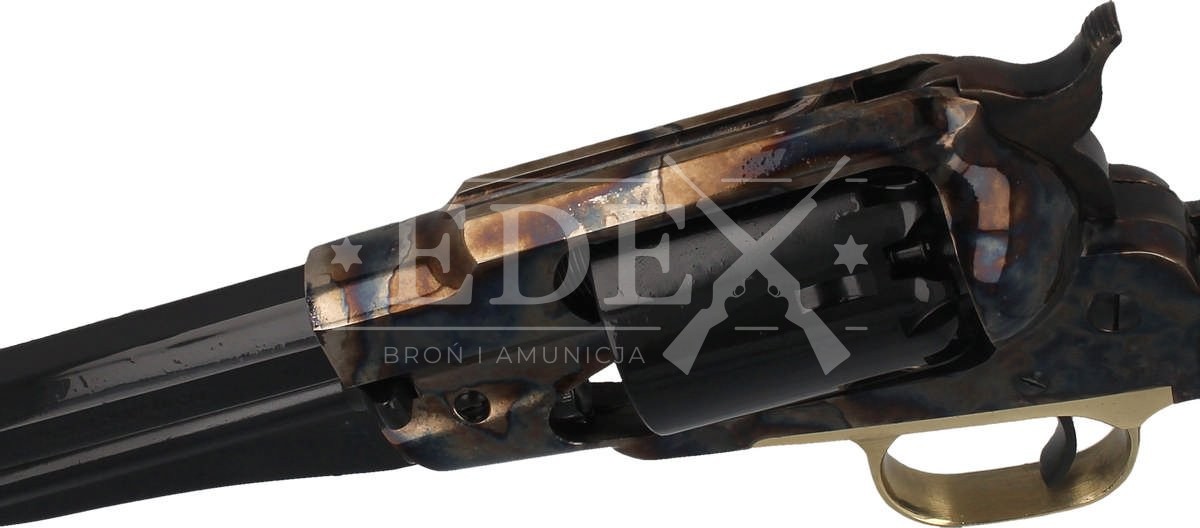 Remington 1858 New Model Army .44, sześciostrzałowy kapiszonowy rewolwer czarnoprochowy firmy Pietta w kalibrze .44, ładowany odprzodowo ze stalową ramą hartowaną ogniowo. Wersja (LC) z moletowanymi okładkami chwytu.